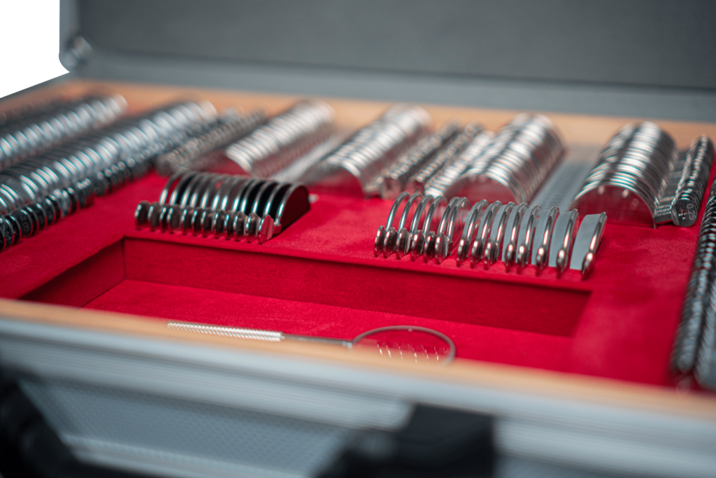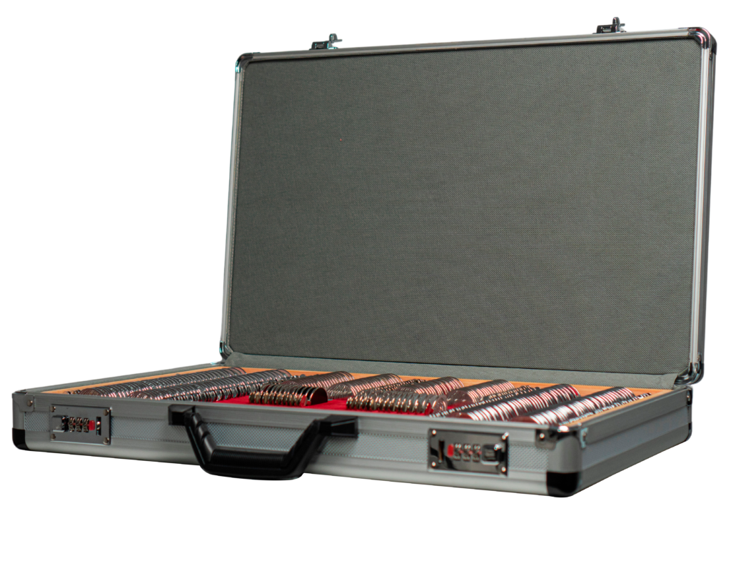 266 probines de cristal con aro metálico y maletín de transporte metálico, bandeja extraíble e indicadores de dioptrías. El kit incluye lentes esféricas cóncavas (-) y convexas (+) para examinar la miopía, la hipermetropía y la presbicia. Además cuenta con lentes cilíndricas positivas y negativas para examinar el astigmatismo y lentes de cilindro cruzado. El kit también cuenta con: prismas que permiten realizar pruebas de hasta 10∆D; una lente mate de cubierta semitransparente para bebés y una lente de hendidura que permite examinar el astigmatismo girando esta lente frente al ojo. Finalmente, se incluyen lentes de color para pacientes con cataratas o pruebas de daltonismo y lentes adicionales como Maddox, plano, oclusor y con orificio estenopeico que complementan las opciones de diagnóstico y examen visual.